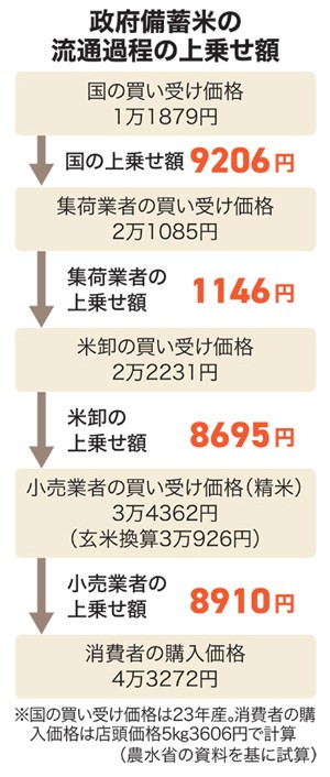 備蓄米上乗せ額が大きいのは? 国、卸、小売り…各9000円前後