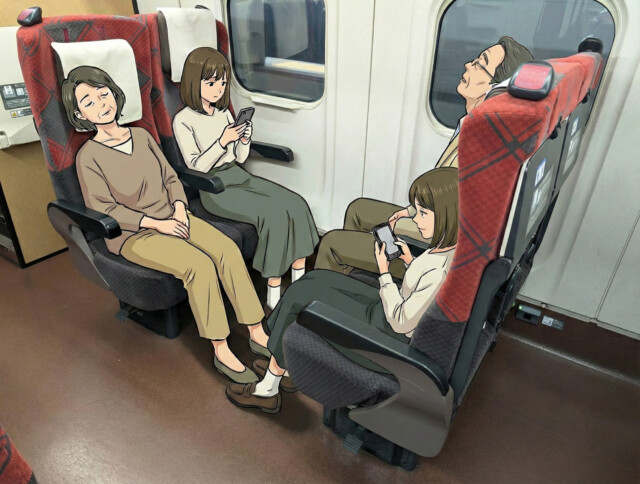 もう、向かい合うより、同じ方向を向いた家族なんだな〜、ってか、シートそのままだよ、なおそうよ…(これ、マジでその方達が座ってた席)
